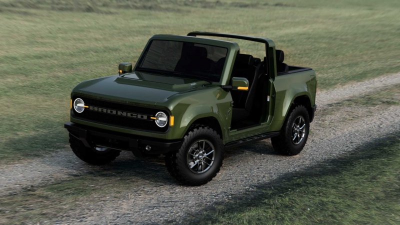 从烘托图中看,福特Bronco的前脸有着复古造型的大灯和Bronco的车型LOGO,它们一致水平摆放在中网上,车顶和车门选用了可拆卸的规划。