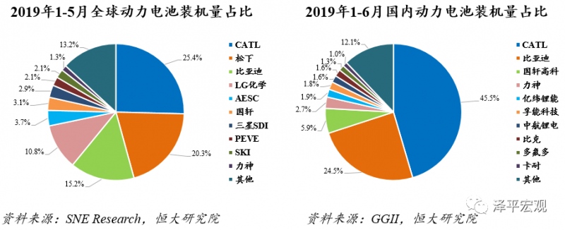 国内市场中本土厂商占据绝大多数市场占有率。由于财政补贴、动力电池白名单等限制,外资在国内装机量很低。据GGII统计,2019年上半年国内动力电池装机量TOP10企业分别为CATL、比亚迪、国轩高科、力神、亿纬锂能、中航锂电、比克、多氟多和卡耐,皆为本土厂商,合计占据87.9%的市场占有率。