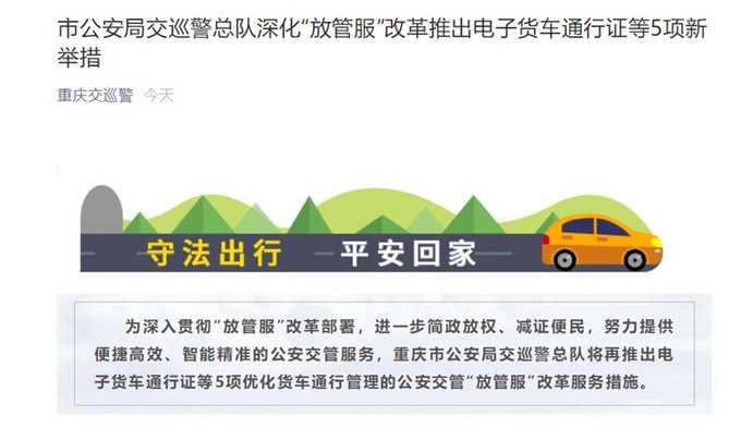 据重庆交警布告显现,为深化遵循“放管服”变革布置,进一步简政放权、减证便民,尽力供给快捷高效、智能精准的公安交管服务,重庆市公安局交巡警总队将再推出电子卡车通行证等5项优化卡车通行办理的公安交管“放管服”变革服务方法,此次推出优化卡车通行办理的5项方法,将依照分批推广的方法连续施行。