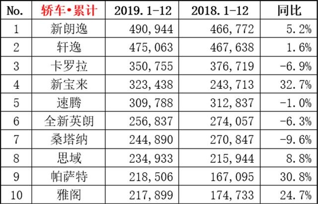 比较2018年度,2019年轿车销量前十车型中,思域、帕萨特(参数|图片)、雅阁为新入围车型,其他7款车型在2018年度亦有入围。此外,在2018年度销量排名第九的帝豪在2019年度排名第十一,迈腾(参数|图片)则由此前的第十退至第十四;至于捷达(参数|图片)则因成立了新品牌,不在新榜单中。