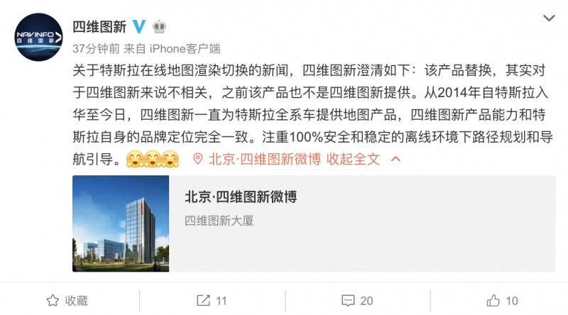 随后,四维图新转发了特斯拉“官宣”微博,并回应称,车机端地图包全系都是四维图新数据,对其在特斯拉产品和服务供给不受任何影响。