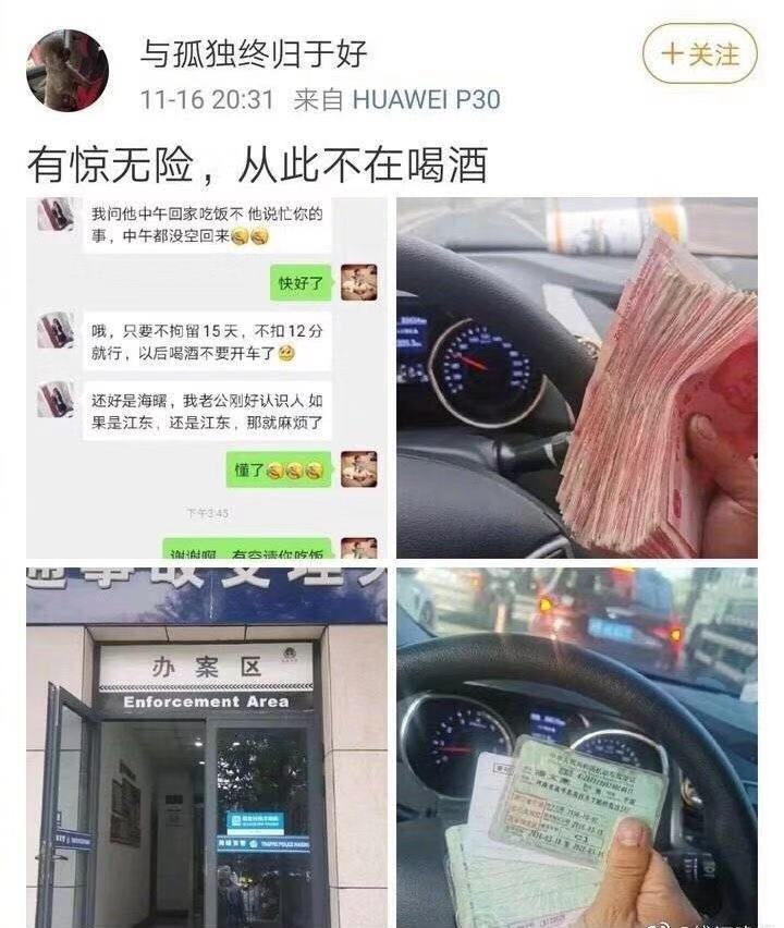 11月16日晚,网友“与孤单终归于好”在微博上发文夸耀自己酒驾被抓,找联络托人“帮助”后未被处分,并晒出多张相片,配文称“有惊无险,从此不再喝酒。”事情发酵后引发许多重视。