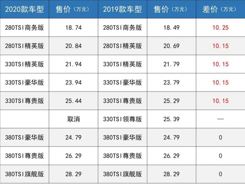 入门车型280TSI商务版的价格从18.49万元涨至18.74万元,新车会撤销330 TSI 领尊版车型。