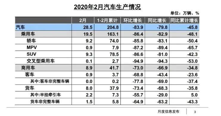 最新的中汽协多个方面数据显现:2020年2月,受新冠肺炎疫情的严峻影响,轿车行业的产销呈现大幅下滑。轿车产销别离完结28.5万辆和31万辆,环比均下降83.9%,同比别离下降79.8%和79.1%。