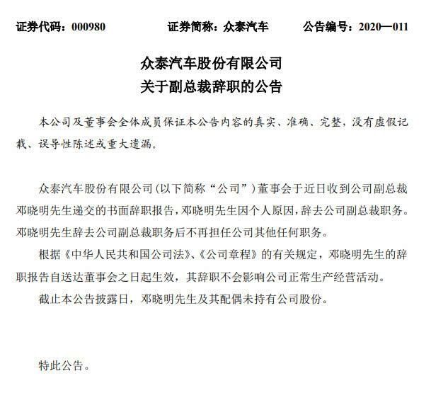 3月17日,众泰轿车发布布告称,董事会于近来收到公司副总裁邓晓明递送的书面辞去职务报告,一起,邓晓明将不再担任该公司其他任何职务。邓晓明因个人原因,辞去公司副总裁职务,依据众泰轿车2018年发表的财报显现,邓晓明税前薪酬为40万元,并未持有公司股份。
