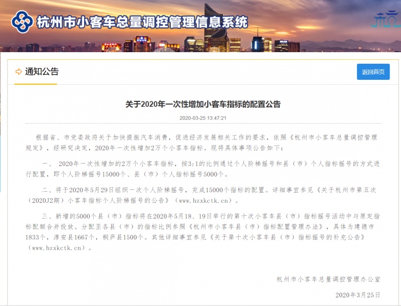 依据省、市党委政府关于加速提振轿车消费,促进经济发展相关作业的要求,按照《杭州市小客车总量调控办理规则》,经研究决定,2020年一次性添加2万个小客车目标。现将具体事项布告如下: