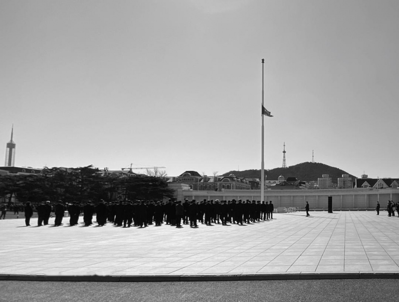 4月4日,清明节,大连市公民广场下半旗志哀,公民广场国旗北侧举办大连市向新冠肺炎疫情献身勇士和去世同胞的哀悼典礼。