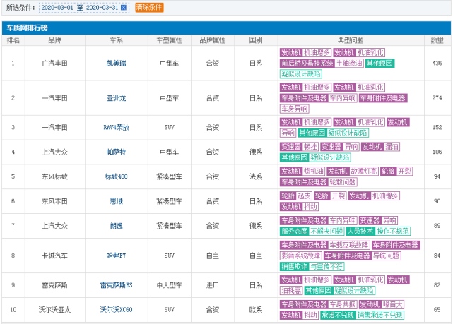 由于“机油门”事情的突发性,导致丰田系的许多车型被牵扯在内,例如排在第1位的广汽丰田凯美瑞(参数|图片)、排在第2位及第三3位的一汽丰田亚洲龙(参数|图片)、RAV4荣放,及排在第9位的纯进口雷克萨斯ES,均因机油增多或乳化等问题导致投诉量反常飙升!