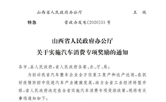 据了解,山西省人民政府施行轿车消费专项奖赏方针,是为拉动山西省轿车整车企业全方位复工复产和达产达效,在抓好疫情防控中促进轿车产业健康发展,助力山西省工业经济转型晋级。