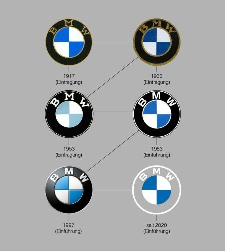初版宝马LOGO有着隐喻“雍容华贵”的金色边框和文字,到了1953年被白色的双圆边框、白色的“BMW”字母替代,1997年参加凸显动感的立体化规划,再到2020年将外圆环黑色圆环部分以通明方式呈现,标识内部的蓝色与白色更为纯洁明澈,呈现出扁平化规划理念,一步一步的改变,都是宝马不断拥抱年代,与年青顾客同行的不可磨灭的痕迹。