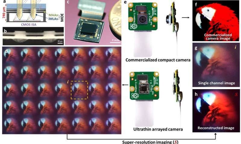 该款彻底封装好的超薄阵列摄像头成功演示了从微透镜取得的高对比度明晰阵列图画。为了进一步提高获取图画的质量,研讨人员们评论了昆虫研讨的视觉原理,并经过超分辨率成像技能将阵列图画合成为一幅图画。此外,研讨人员还初次演示了超分辨率成像,该技能从高对比度阵列图画中得到了高对比度、高分辨率的单一集成图画。