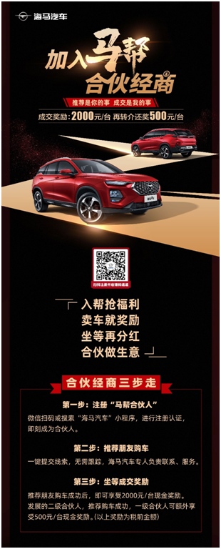 据了解,2020年,海马轿车方案邀约10万名马帮合伙人。马帮合伙人选用二级分销方式,完成裂变分散。具体来说,作为马帮一级合伙人,用户经过引荐海马轿车取得成交佣钱——2000元/台,订单越多报答越多。别的,经过约请老友成为马帮二级合伙人,用户还能够共享老友的成交奖赏——500元/台,给朋友实惠的一起,让自己收益多多。