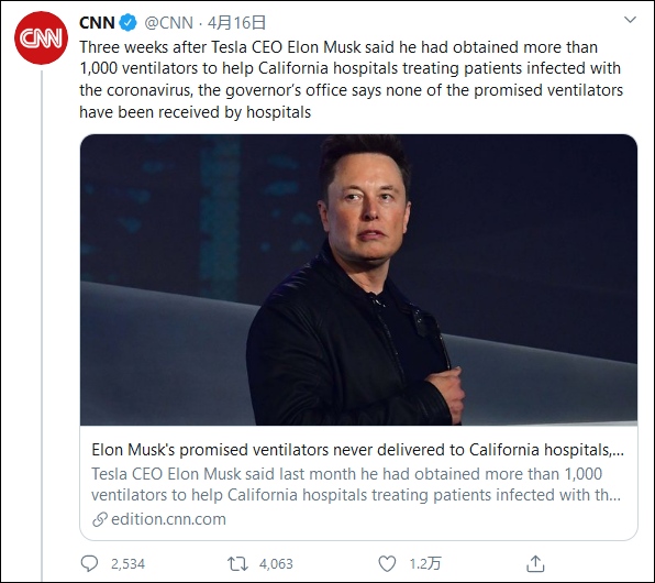 4月16日,CNN发布了一篇报导称,在马斯克表明向加州医院捐献1000多台呼吸机三周后,该州州长办公室表明医院没有收到任何呼吸机。而特斯拉发言人也没有回应置评恳求。