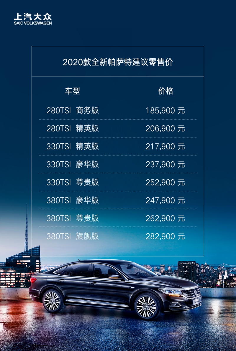 日前,咱们从上汽群众官方得悉,2020款的群众帕萨特正式上市,其合计推出8款车型,价格区间为18.59-28.29万元。具体车型价目如下: