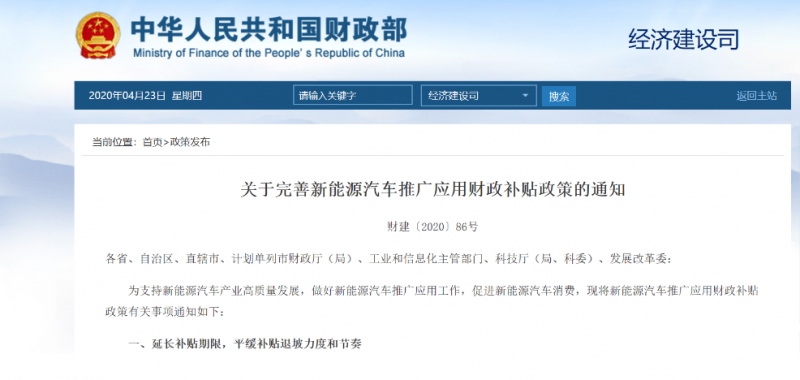 4月23日,财政部正式下发《关于完善新能源轿车推行运用财政补助方针的告诉》,《告诉》称,将新能源轿车推行运用财政补助方针施行期限延伸至2022年末。2020年补助规范不退坡,2021-2022年补助规范别离在上一年根底上退坡10%、20%。