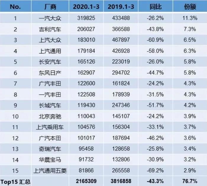 根据乘联会发布的一季度批售数据,一汽-大众实现31.98万辆,同比下滑26.2%;上汽大众则仅有18.30万辆,同比下滑60.9%。