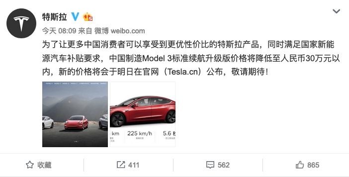 特斯拉又降价国产Model3规范续航版将降至30万内