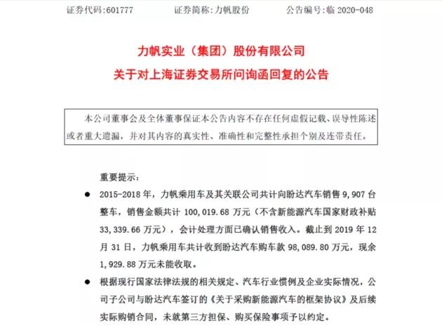 今日咱们要说的工作是关乎国内纯电动轿车的质量上的问题,工作原因是在5月6号,力帆实业(集团)股份有限公司发布的关于对上海证券交易所问询函回复的布告,布告中首要对上海证券交易所对力帆乘用车有限公司和盼达轿车之间的胶葛给出了回复。