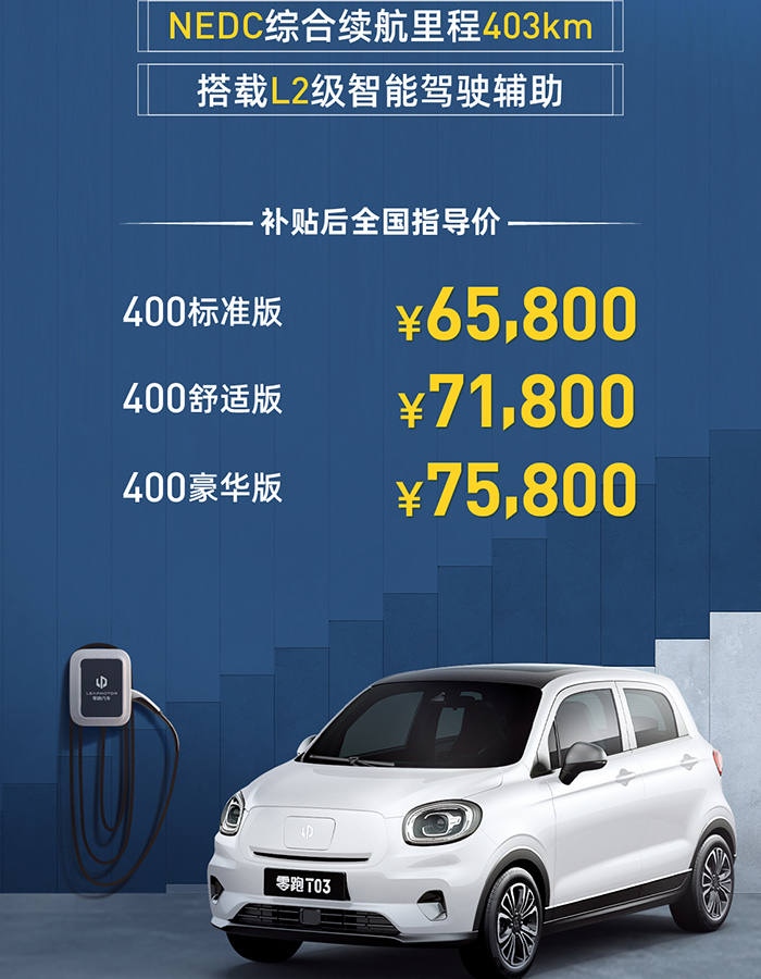 5月11日,零跑轿车旗下第二款车型T03正式上市。新车定位微型电动车,共推出规范版/舒适版/豪华版3个版别,补助后价格分别为6.58/7.18/7.58万元。 新车搭载L2级智能驾驭辅佐体系,NEDC续航到达403km,装备高于同级车型,性价比适当高。