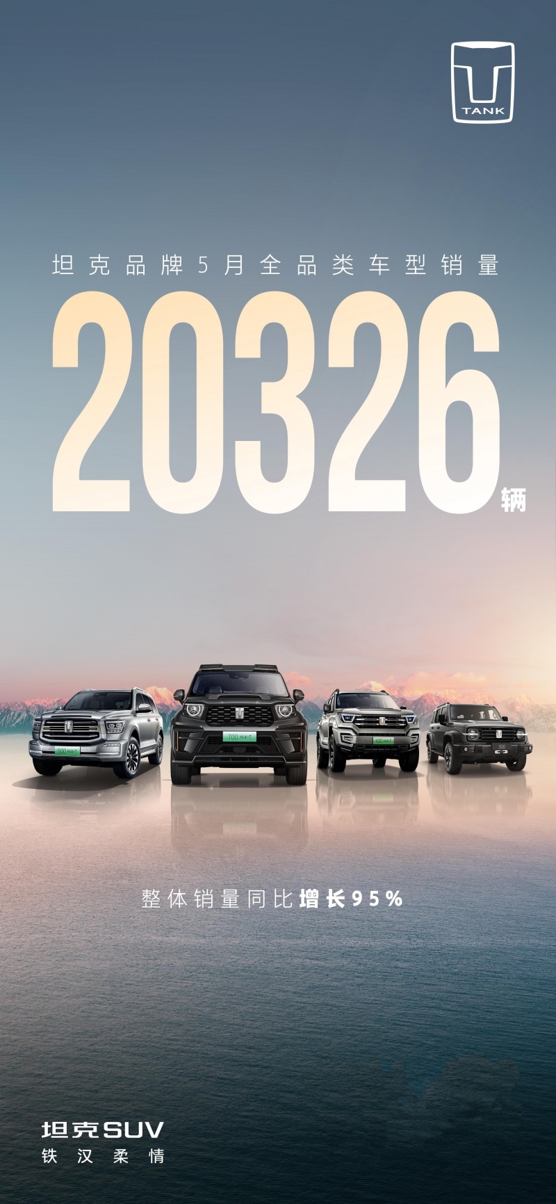 6月6日,坦克品牌发布5月销量数据,坦克品牌全品类销量20326辆,整体销量同比增长95%,连续两月销量破2万;坦克品牌新能源车型5月销量9867辆,环比增长13%,创下坦克品牌历史新能源销量和新能源车型销量占比新高峰。中国越野SUV第一品牌,坦克当之无愧。